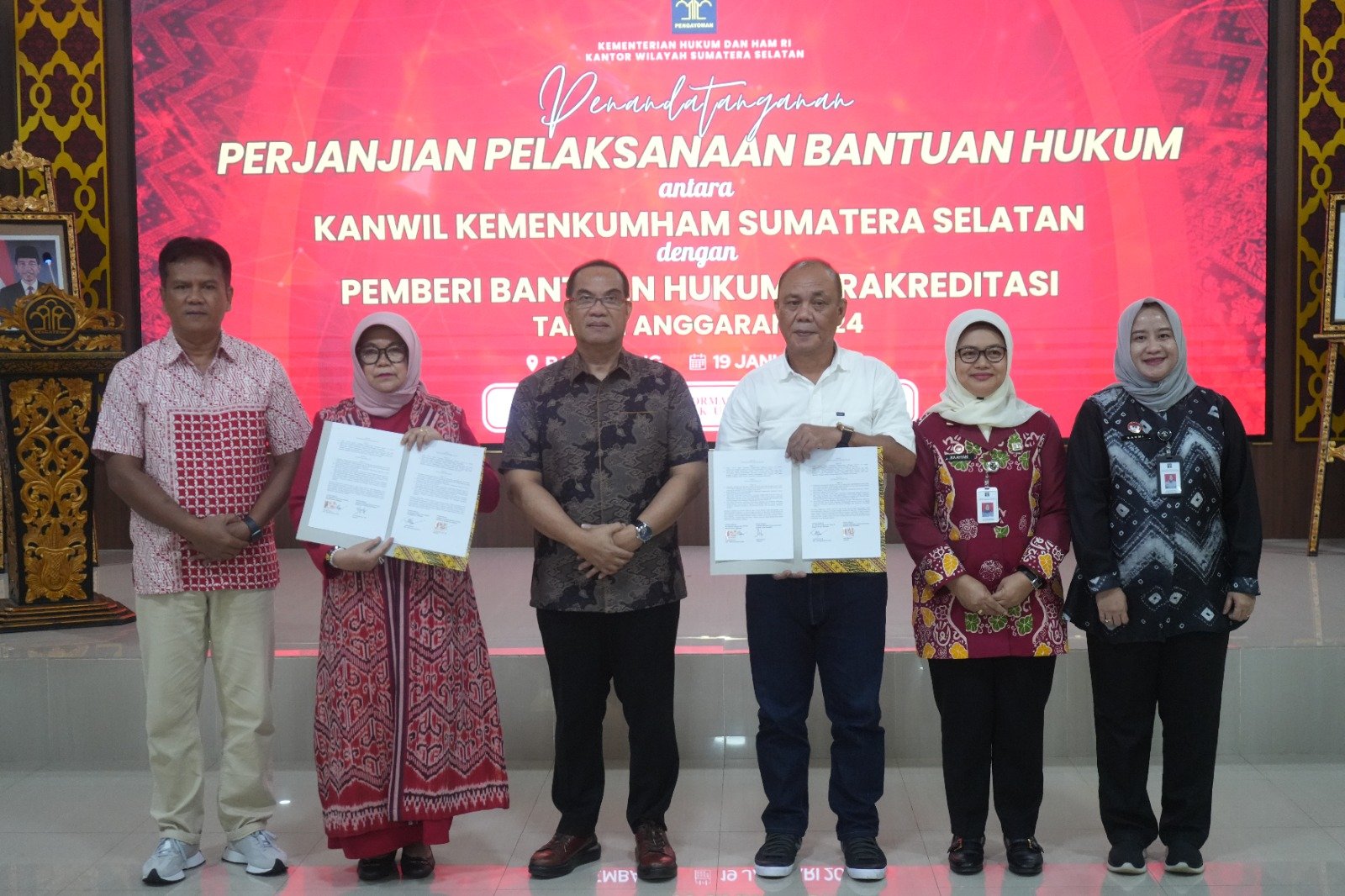 MATTANEWS.CO, PALEMBANG – Sebanyak 13 (tiga belas) Organisasi Bantuan Hukum (OBH) yang terakreditasi di Wilayah Sumatera Selatan menandatangani Perjanjian Pelaksanaan Bantuan Hukum bertempat di Aula Musi Kanwil Kemenkumham Sumsel, Jumat (19/1). Kegiatan penandatanganan disaksikan secara langsung oleh Kakanwil Kemenkumham Sumsel, Dr. Ilham Djaya.