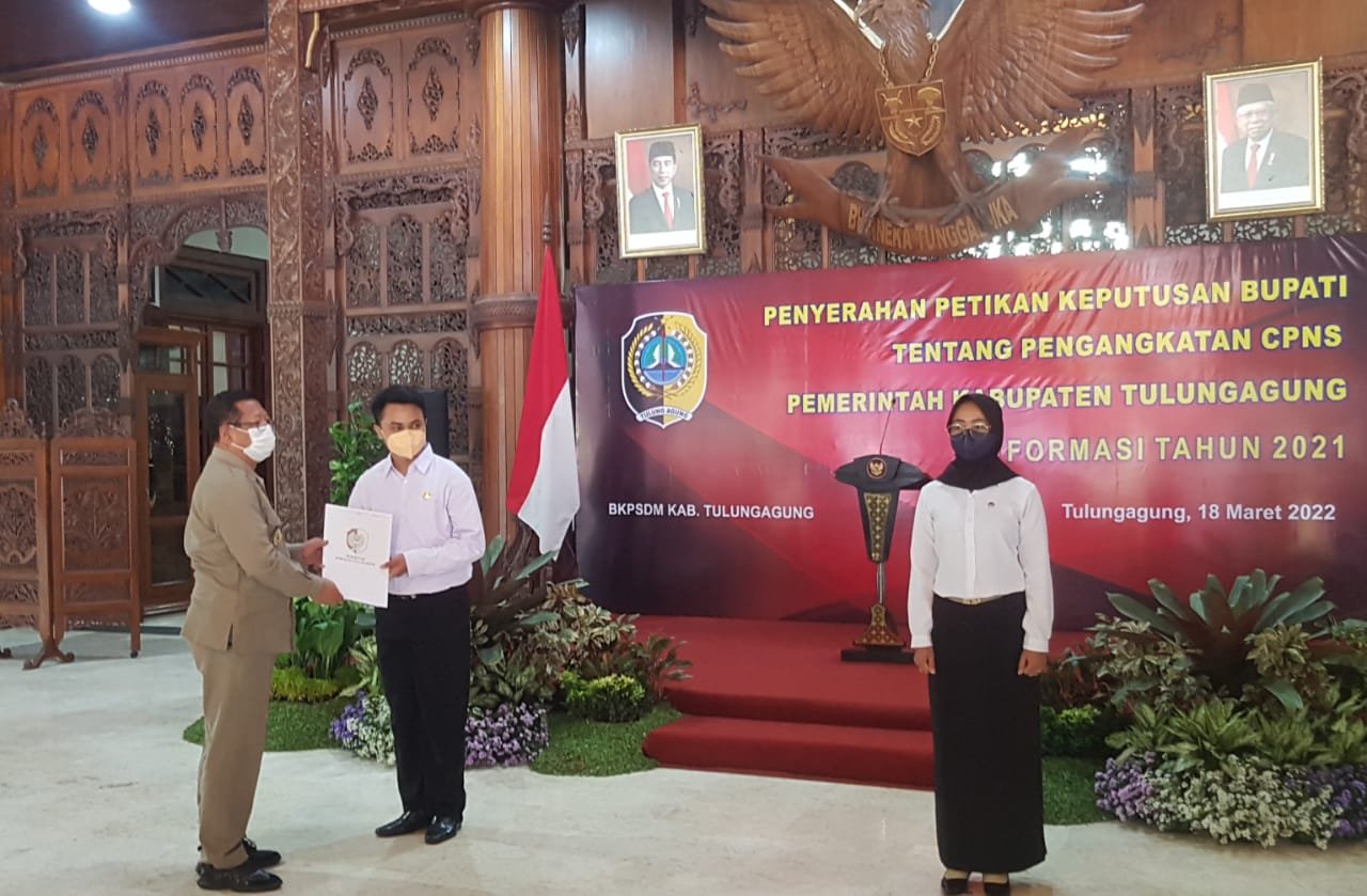 “Jadi begini, hari ini kita serahkan petikan Surat Keputusan pengangkatan CPNS formasi 2021 kepada 159 Calon Pegawai Negeri Sipil di lingkungan Pemerintah kabupaten Tulungagung,” kata Bupati Maryoto didampingi Wakil Bupati Tulungagung H. Gatut Sunu Wibowo, S.E., dihadapan insan media.