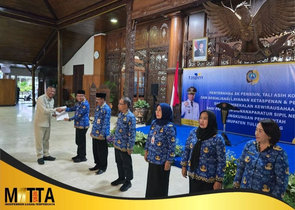 MATTANEWS.CO,TULUNGAGUNG – Suasana haru menyelimuti Pendopo Kongas Arum Kusumaning Bongso saat H. Gatut Sunu Wibowo menyerahkan Surat Keputusan (SK) pemberhentian dan pemberian pensiun kepada puluhan Aparatur Sipil Negara (ASN), Rabu (18/2/2026) sore. Momentum ini bukan sekadar agenda administratif, melainkan penanda berakhirnya perjalanan panjang pengabdian aparatur sipil negara di lingkungan Pemerintah Kabupaten Tulungagung.