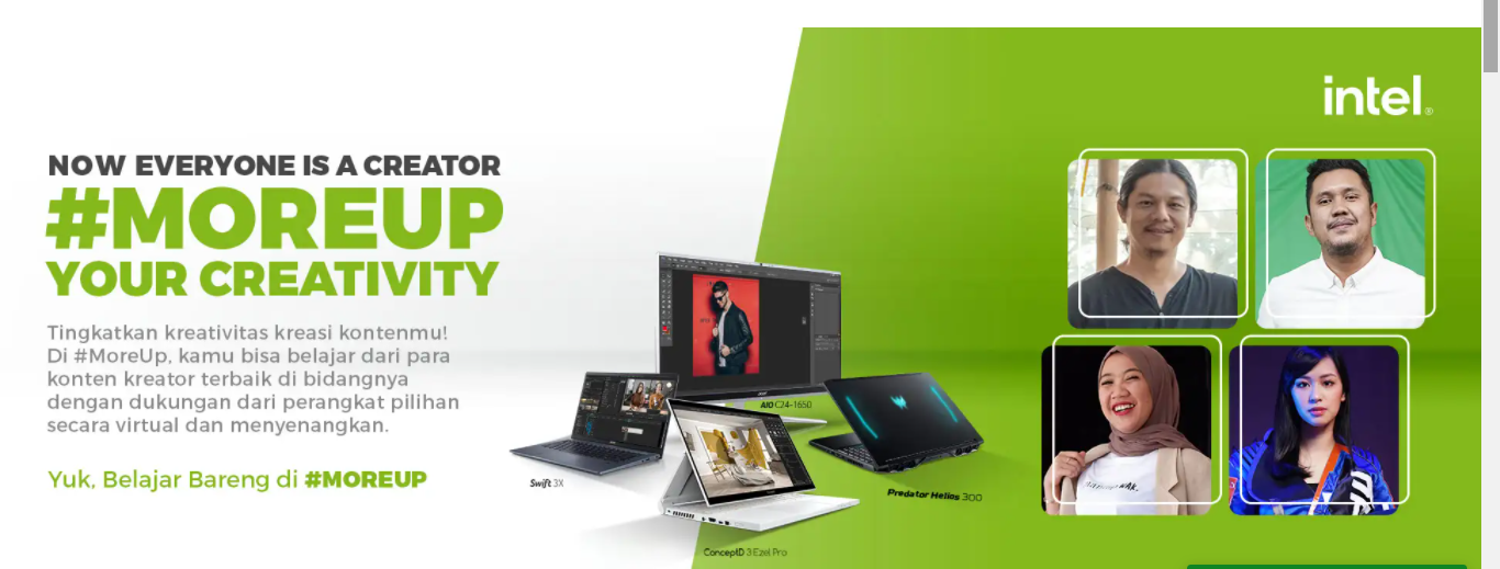 “Kami menghadirkan rangkaian kegiatan #MoreUp untuk memberikan semangat bahwa kini semua orang bisa menjadi konten kreator. Melalui online workshop, para kreator muda akan mendapatkan kesempatan langsung untuk menimba ilmu dan berinteraksi dengan konten kreator ternama, yang akan berbagi pengalaman mereka di bidangnya masing-masing dalam bentuk online workshop. Sebagai perusahaan teknologi ternama dengan pengalaman panjang, Acer senantiasa berinovasi dalam menghadirkan pilihan perangkat yang dapat memenuhi segala kebutuhan masyarakat dari berbagai kalangan, termasuk para konten kreator. Mulai dari kegiatan pencarian ide dan perancangan strategi kreatif, gaming, mendesain, hingga mengedit konten, Acer menawarkan beragam perangkat yang dapat untuk beragam kebutuhan para kreator,” ujar Fransisca Maya – Head of Marketing Acer Indonesia.