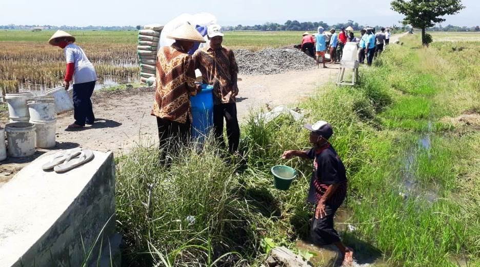 Untuk itu, di lokasi pengecoran jalan, beberapa warga yang ikut gotong royong dalam TMMD sedang menampung air dari saluran irigasi yang berada di kanan kiri sepanjang jalan yang di beton.
