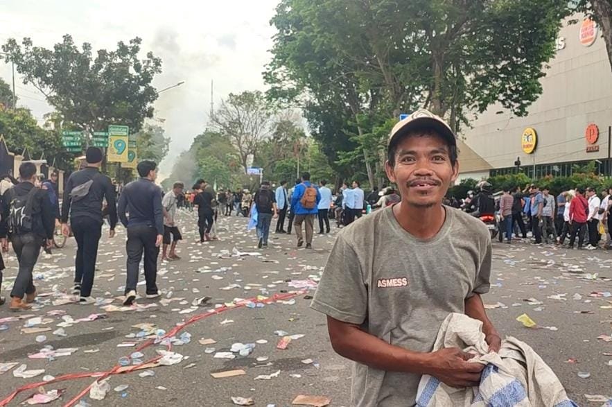 MATTANEWS.CO, PALEMBANG – Aksi Demo yang digelar oleh ribuan mahasiswa dari berbagai Perguruan Tinggi di kota Palembang di depan halaman gedung DPRD Sumsel, guna menuntut kepada pemerintah terkait tunjangan para anggota dewan Rp 3 juta per hari, yang dinilai mencederai dan melukai hati masyarakat, mendatangkan rezeki tersendiri bagi Sobri (40) seorang pemulung, warga Bukit Besar, Senin (1/9/2025)
