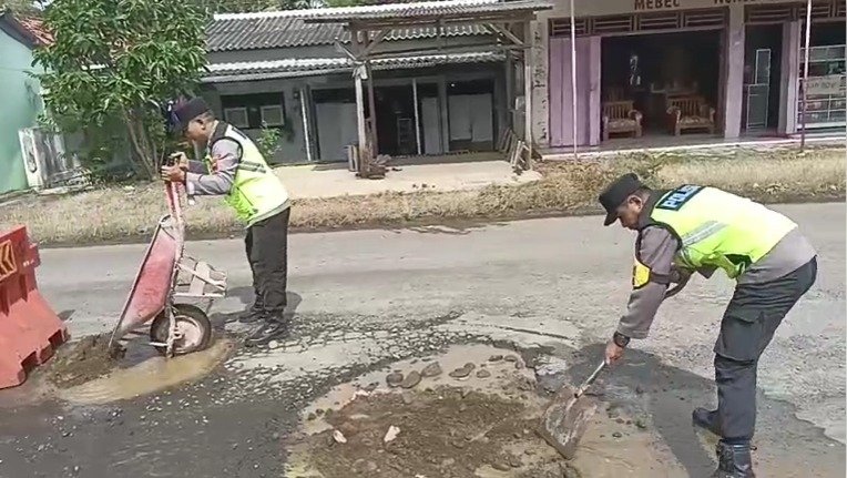 Melihat kondisi tersebut, personel Polsek Sragi segera mengambil tindakan cepat dengan melakukan pengurugan menggunakan material sertu agar permukaan jalan kembali rata dan aman dilalui.