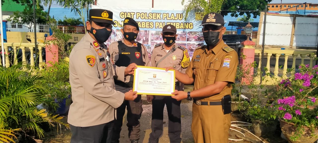 MATTANEWS.CO, PALEMBANG – Dianggap berprestasi dalam peran aktif upaya pengendalian pandemi covid – 19 di Kelurahan Talang Bubuk, Kecamatan Plaju Kota Palembang Provinsi Sumatera Selatan tahun 2021, Kapolsek Plaju Palembang, AKP Novel Siswandi Kurniawan, berikan penghargaan kepada Ketua PPKM Mikro Kelurahan Talang Bubuk Kecamatan Plaju Palembang, Susanto Umar, di Mapolsek Plaju, Senin (17/5/2021).
