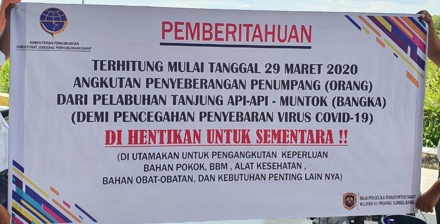 BANGKA BELITUNG, Mattanews.co – Spanduk pemberitahuan perihal pemberhentian pengangkutan penumpang orang dari Pelabuhan Tanjung Api-Api (TAA) Banyuasin Sumsel menuju ke Pelabuhan Tanjung Kalian Bangka Belitung, sudah terpasang sejak tanggal 29 Maret 2020 lalu.