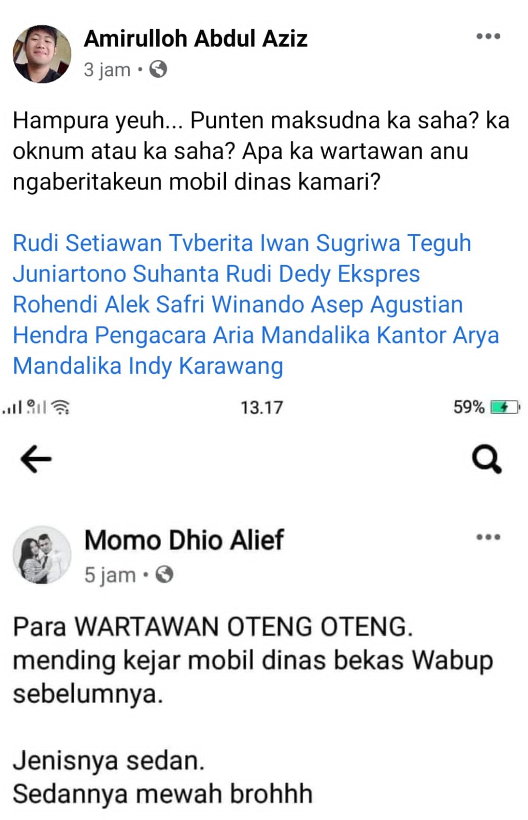 Sehingga Ammirulloh Abdul Aziz mewakili wartawan yang ada di Kabupaten Karawang mempertanyakan dan membuat postingan di facebook juga.