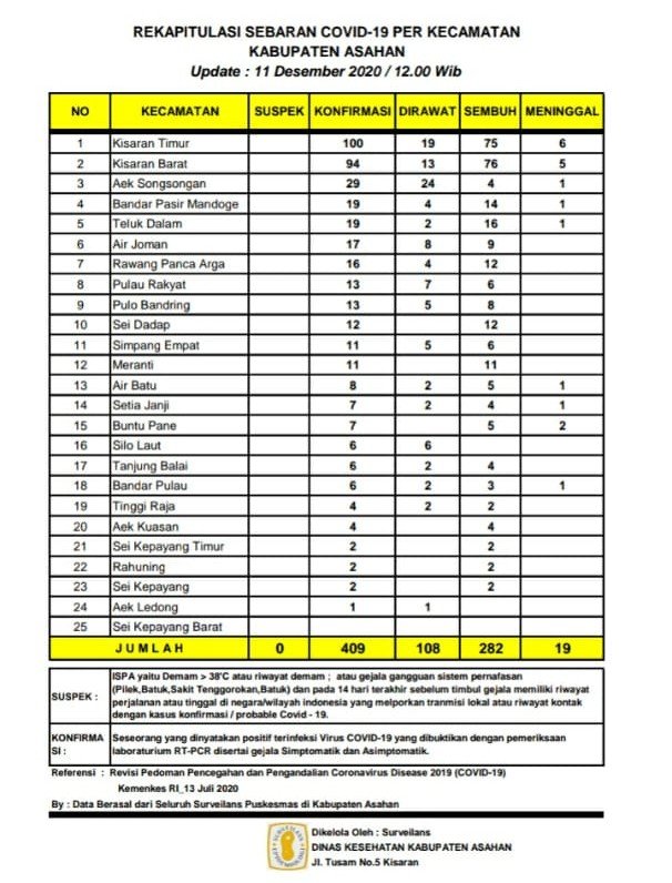 Juru Bicara Gugus Tugas Percepatan Penanganan Covid–19 Kabupaten Asahan H. Rahmat Hidayat Siregar S. Sos. M.Si, mengatakan, berdasarkan hasil data surveilans dari seluruh Puskesmas yang ada di Asahan sebagaimana di kelola Dinas Kesehatan Kabupaten Asahan pertanggal 11 Desember 2020 hingga pukul 12.00 Wib, Jum’at (11/12/2020) melalui group WhatsApp.