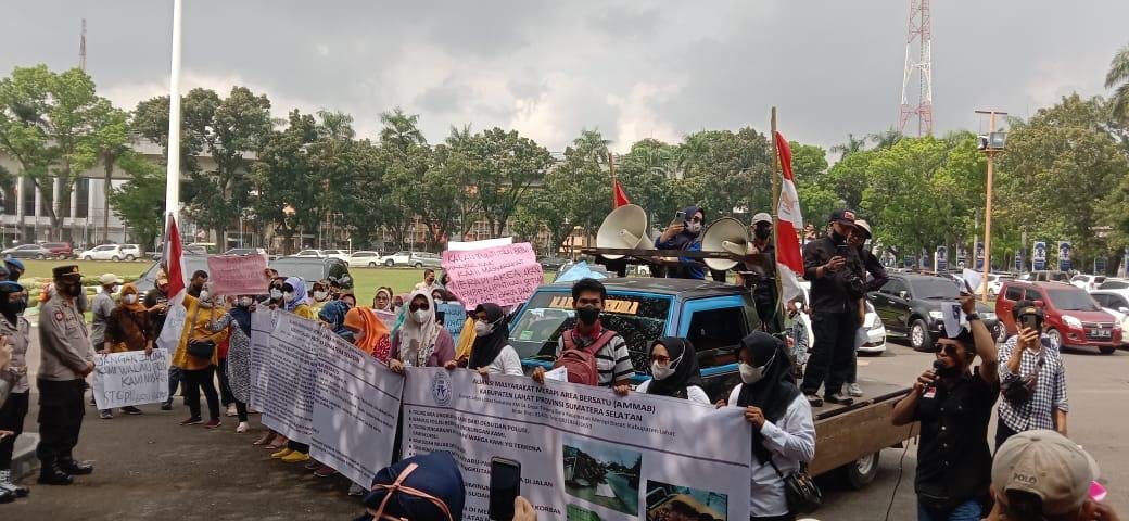 MATTANEWS.CO, PALEMBANG – Puluhan pendemo dari Aliansi Masyarakat Merapi Area Bersatu (AMMAB) Kabupaten Lahat Provinsi Sumatra Selatan (Sumsel) datangi Kantor Gubernur Sumsel, Senin (8/4/2022).
