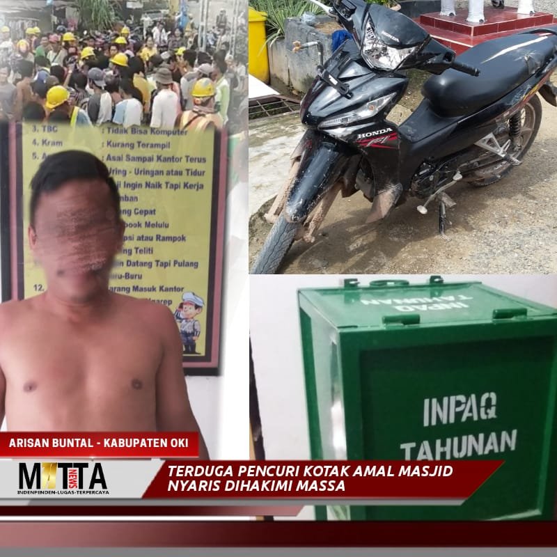 KAYUAGUNG, Mattanews.co – Diduga hendak mencuri kotak amal Masjid Istiqomah Dusun I Arisan Buntal Kayuagung, Kabupaten Ogan komering Ilir (OKI), Rinto Harahap nyaris dihakimi massa setempat. Dalam proses evakuasi, polisi berjibaku menghindari amukan massa yang hendak main hakim sendiri. Selain itu, kendaraan milik anggota polisi mengalami kerusakan ringan pada bagian kaca belakang.