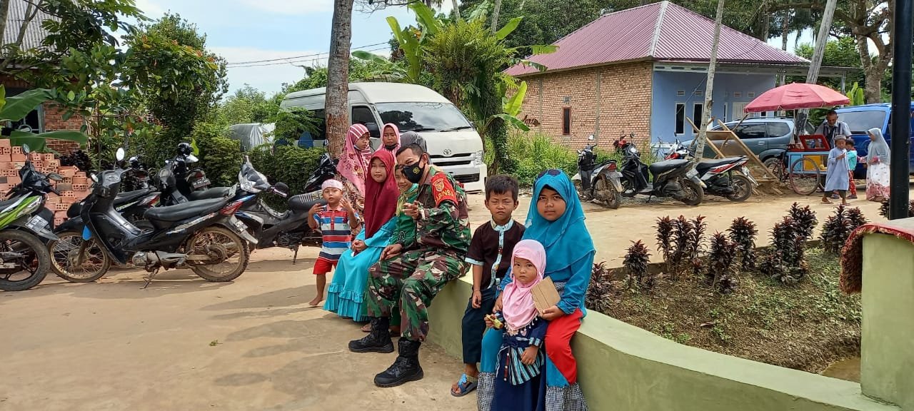 MATTANEWS.CO,PALEMBANG – Disela-sela kesibukan pengerjaan fisik TMMD 110 Kodim 0418 Palembang, anggota Satgas TMMD juga terlihat membaur kepada anak-anak usai mengikuti kegiatan Isra Miraj di Masjid Nurul Iman, Jumat (19/3/2021).