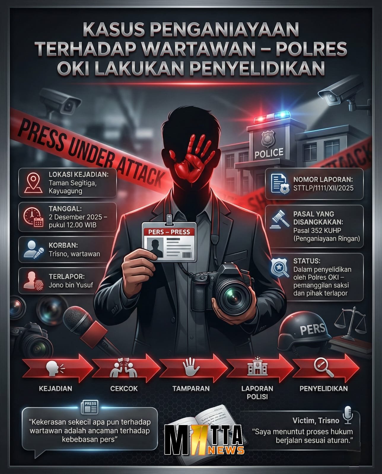 MATTANEWS.CO, OKI – Kekerasan terhadap jurnalis kembali terjadi di Kabupaten Ogan Komering Ilir (OKI). Trisno Okonisator, salah satu jurnalis media daring, melaporkan dugaan penganiayaan ke Polres OKI pada Selasa (2/12) kemarin. Laporan tersebut diterima dengan Surat Tanda Terima Laporan (STTLP) Nomor 1111/XII/2025.