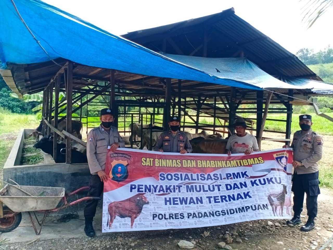 MATTANEWS.CO, PADANGSIDIMPUAN –Dalam rangka mengantisipasi wabah penyakit mulut dan kuku (PMK), Kasat Binmas Polres Padangsidimpuan, AKP Sulhan Arifin Siregar, SH, bersama anggota melaksanakanan peninjauan sekaligus sosialisasi ke kandang ternak milik Zulkipli Siregar, di Jalan Raja Inal Siregar, Kelurahan Batunadua Jae, Kecamatan Batunadua, Kamis (7/7/2022) siang.