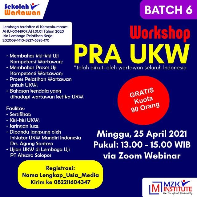MATTANEWS.CO, PURWAKARTA – Kegiatan Pra Uji Kompetensi Wartawan yang digelar oleh MZK Institute memasuki Batch 6, yang rencananya dilaksanakan hari minggu (25/04/21). Dimajukan lebih cepat karena kuota yang sudah penuh melalui Zoom Webinar, Workshop Pra UKW ini diikuti oleh 90 wartawan dari berbagai Media Online, dan Media Cetak yang tersebar di 16 Provinsi, dimulai jam 09.30 Wib sampai jam 11.30 Wib.