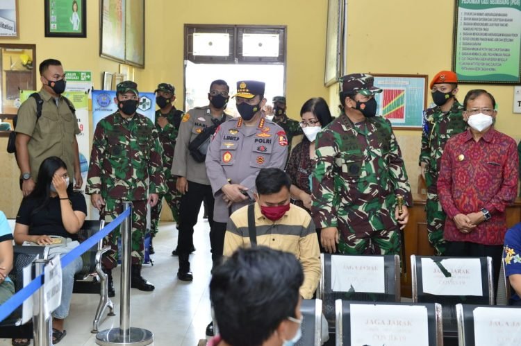 MATTANEWS.CO, JAKARTA– Panglima TNI Marsekal Hadi Tjahjanto bersama Kapolri Jenderal Listyo Sigit Prabowo meninjau secara langsung pelaksanaan vaksinasi Covid-19 anggota TNI-Polri di Gedung Olahraga Praja Kepawon Kodam Udayana Bali, Jumat (19/3/2021).