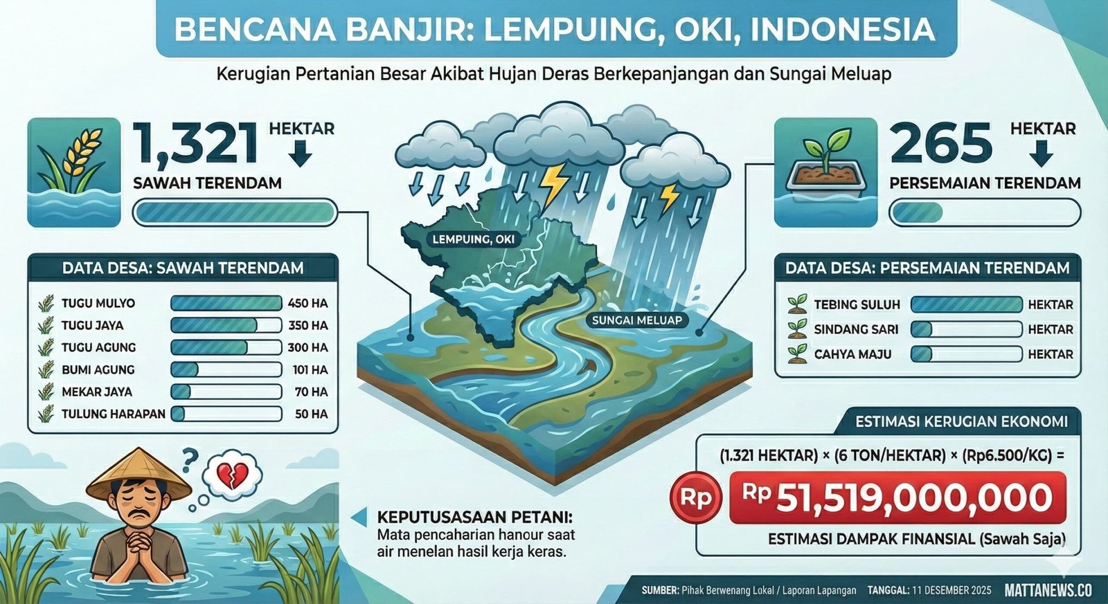 MATTANEWS.CO, OKI – Banjir merendam 1.321 hektare lahan padi dan 265 hektare persemaian di Kecamatan Lempuing, Kabupaten Ogan Komering Ilir (OKI), Sumatera Selatan. Genangan air yang bertahan selama dua hari terakhir ini mengancam petani mengalami gagal tanam dan gagal panen.