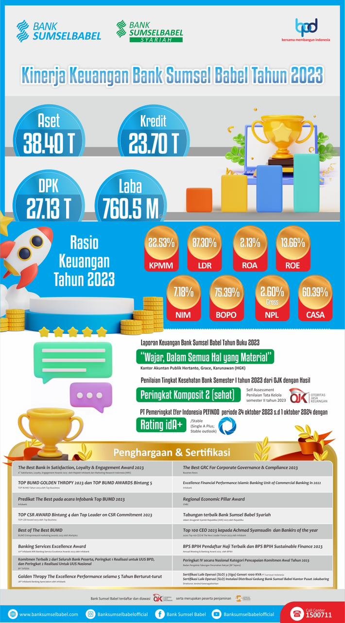 Selama tahun (2023) Bank Sumsel Babel memperoleh pencapaian kinerja yang mengesankan. Dengan total aset naik sebesar 8.80% dari tahun sebelumnya (yoy), Bank menunjukkan tak hanya kemampuan mengelola keberlanjutan tetapi juga potensi pertumbuhan yang signifikan.