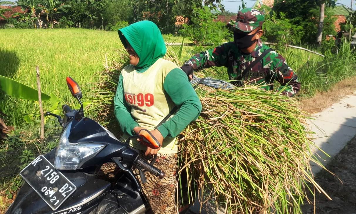 hal itu juga dibuktikan oleh Kopda Nur Sholeh, angggota Satgas TMMD Reguler yang sehari-harinya dinas di Koramil 07/Wirosari. Disaat tengah sibuk bekerja di pembangunan jalan TMMD, dia menyempatkan salah seorang warga, Dasimah (42) yang keberatan saat akan menaikan dami pakan sapi ke atas motornya.
