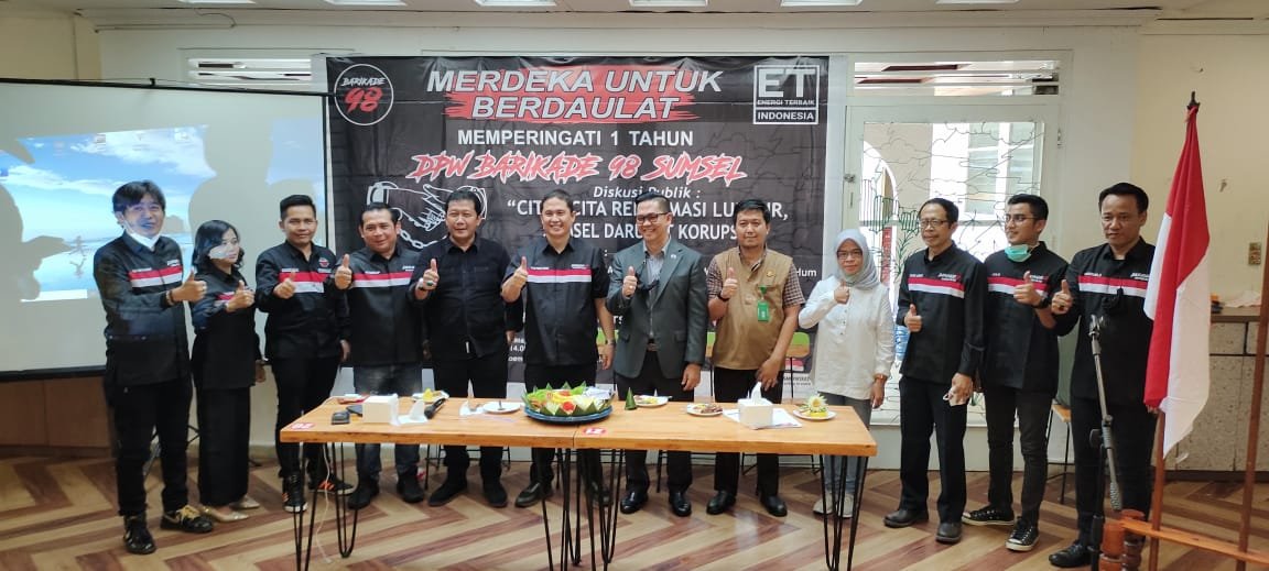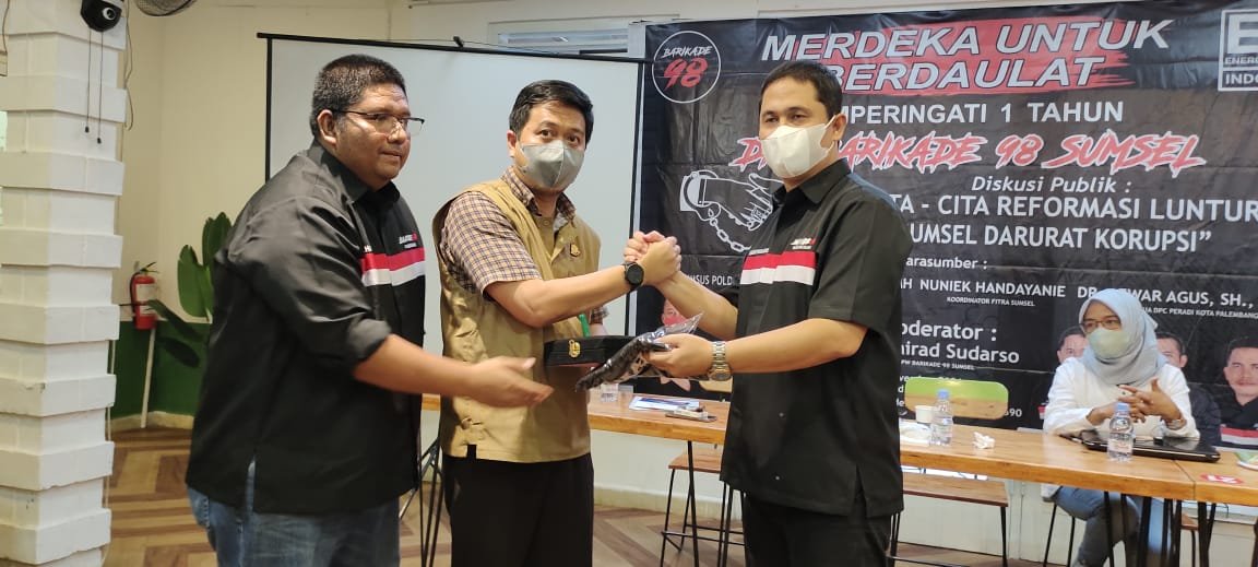 MATTANEWS.CO, PALEMBANG – Dewan Perwakilan Wilayah (DPW) Barikade 98 Sumsel menggelar diskusi publik mengusung tema “Cita-cita Reformasi Luntur, Sumsel Darurat Korupsi“. Kegiatan digelar di Rumah Merdeka, dalam acara ini turut dihadiri para mahasiswa, penggiat anti korupsi dan penegak hukum, Selasa (30/11/2021).