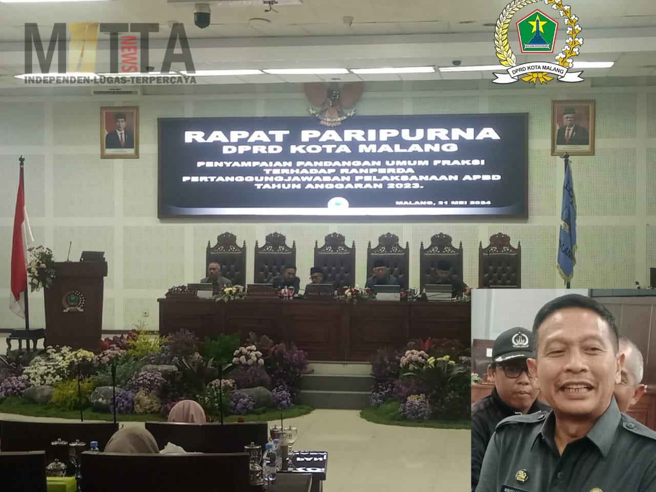 MATTANEWS.CO, KOTA MALANG – Rapat Paripurna DPRD Kota Malang, terkait dengan Penyampaian Pandangan Umum Fraksi Terhadap Ranperda Pertanggungjawaban Pelaksanaan APBD Tahun Anggaran 2023, berlangsung di Gedung Paripurna DPRD Kota Malang, Jumat (31/5/2024).