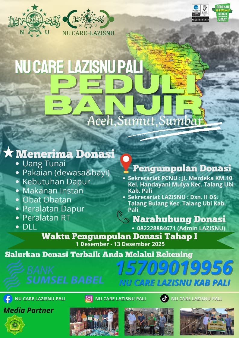 MATTANEWS.CO, PALI – Pengurus Cabang Nahdlatul Ulama (PCNU) Kabupaten Penukal Abab Lematang Ilir (PALI), Provinsi Sumatera Selatan (Sumsel) melalui NU Care-LAZISNU menerima donasi peduli banjir Aceh, Sumatera Utara (Sumut), dan Sumatera Barat (Sumbar).