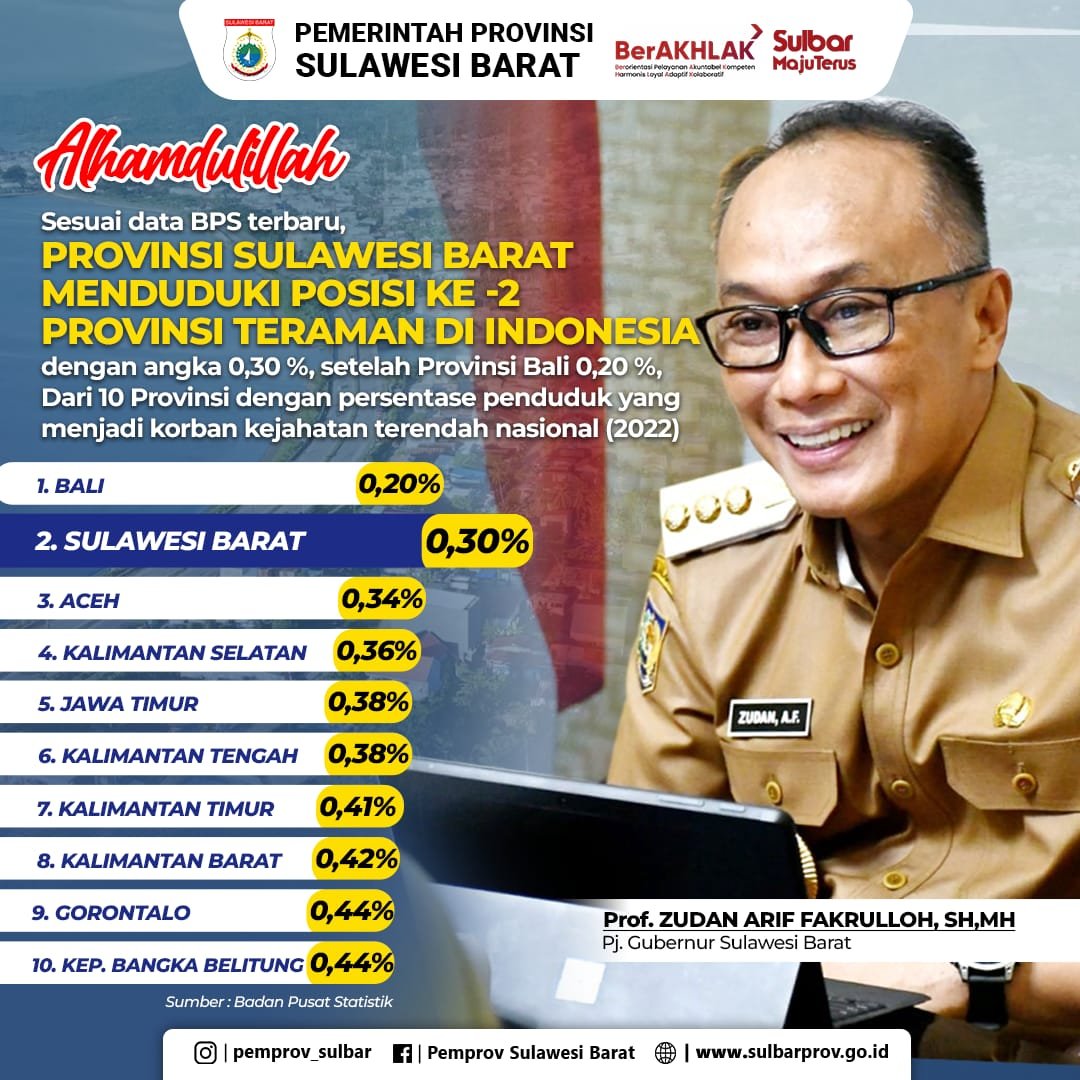 Pj Gubernur Sulbar Prof.Zudan Arif Fakrulloh, mengatakan, berdasarkan data BPS , mencatat 10 Provinsi yang masuk sebagai provinsi teraman di Indonesia.