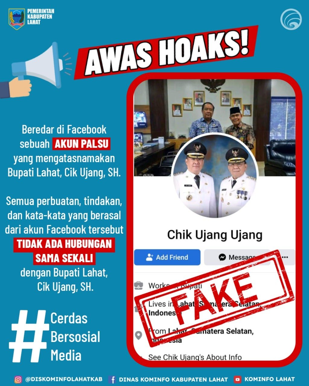 MATTANEWS.CO,LAHAT – Beredar akun facebook atas nama Bupati Lahat ” Chik Ujang Ujang ” Kadis Kominfo Lahat Rudi Dharma Setiawan SE MSi pastikan akun facebook tersebutnpalsu alias hoax.