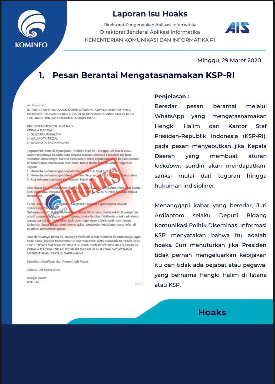 Pihak Kantor Staf Presiden (KSP) Melalui Staf Khusus Presiden Bidang Hukum Dini Purwono menegaskan bahwa kabar soal adanya surat teguran keras dari Presiden Joko Widodo (Jokowi) kepada 3 kepala daerah karena melakukan lockdown terkait penanganan virus Corona (Covid-19) adalah hoax.