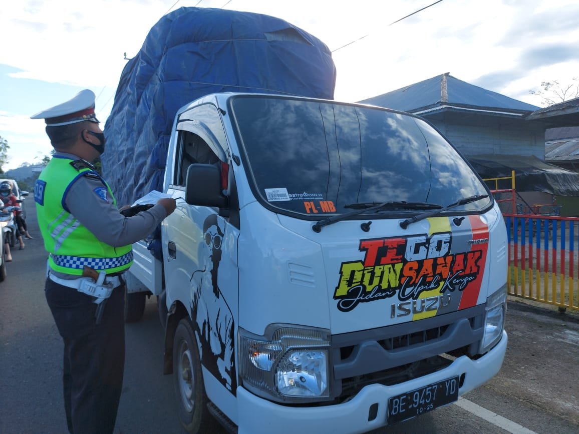 MATTANEWS.CO, LAMPUNG BARAT – Jajaran Satuan Lalu lintas Polres Lampung Barat (Lambar) menindak tiga pelanggar lalu lintas yang berpotensi laka lantas seperti muatan lebih (Overloading) dan memberikan teguran kepada 14 pengendara tidak memakai masker.