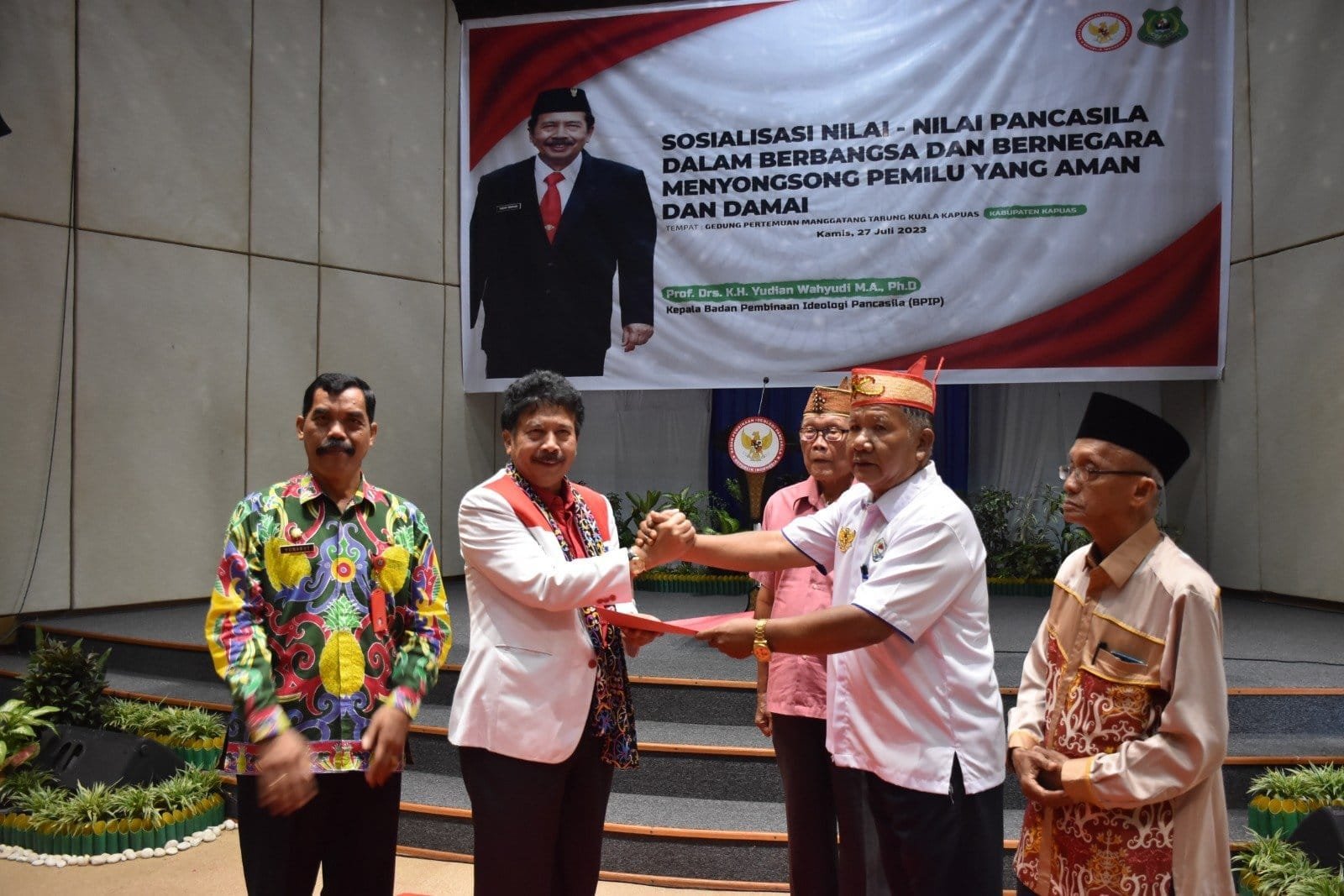 Kegiatan tersebut secara langsung dihadiri Kepala BPIP RI Prof. Drs. KH Yudian Wahyudi, MA, Ph.D, Deputi Bidang Hubungan Antar Lembaga, Sosialisasi, Komunikasi dan Jaringan Prakoso, Plt Bupati Kapuas HM Nafiah Ibnor yang dalam hal ini diwakili Staf Ahli Bidang Pemerintahan, Hukum dan Politik Yunabut, Kepala Badan Kesbangpol Kapuas Hj Marlina K., Kepala Perangkat Daerah Lingkup Pemerintah Kabupaten Kapuas dan Peserta Sosialisasi yang hadir.