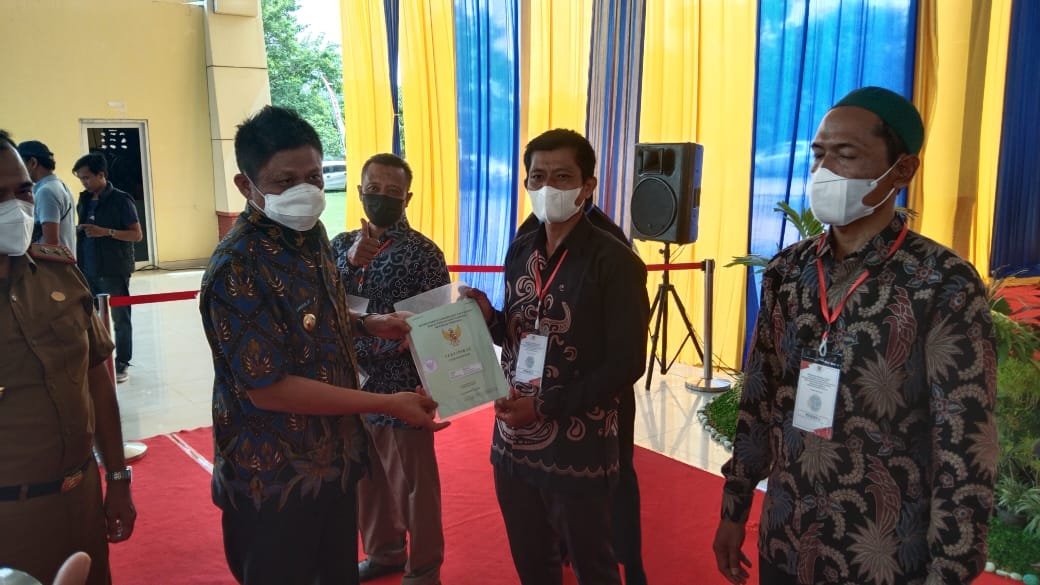 MATTANEWS.CO, OKU TIMUR – Kementerian Agraria menyerahkan sertifikat tanah simbolis kepada Bupati OKU Timur, Lanosin, (Enos) di Balai Rakyat, Selasa (14/12/2021).