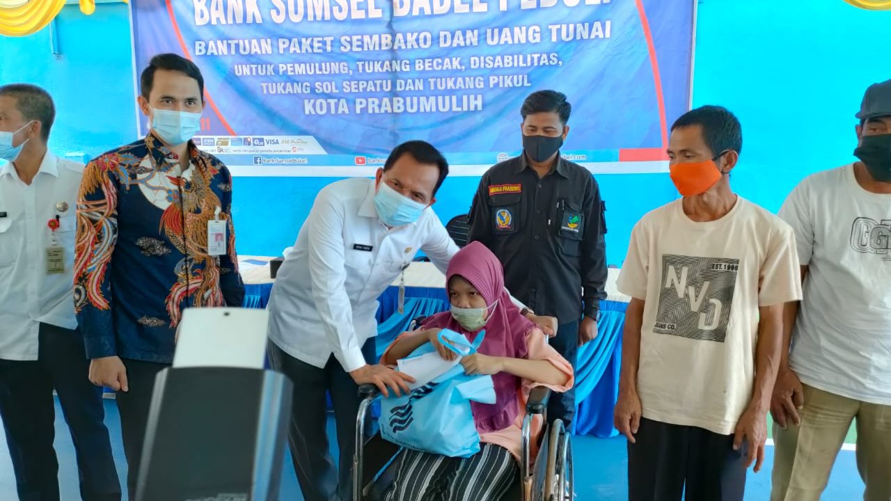 Bantuan paket sembako dan uang tunai untuk pemulung, tukang becak, disabilitas, tukang sol sepatu dan tukang pikul tersebut, diserahkan secara simbolis oleh Walikota Prabumulih Ir Ridho Yahya MM didampingin Pimpinan Bank Sumsel Tian Kadaumpu Yamin dan Kepala Dinas Sosial Heryanto di Halaman Belakang Kantor Bank Sumsel Babel Cabang Prabumulih, Rabu (05/05/21).