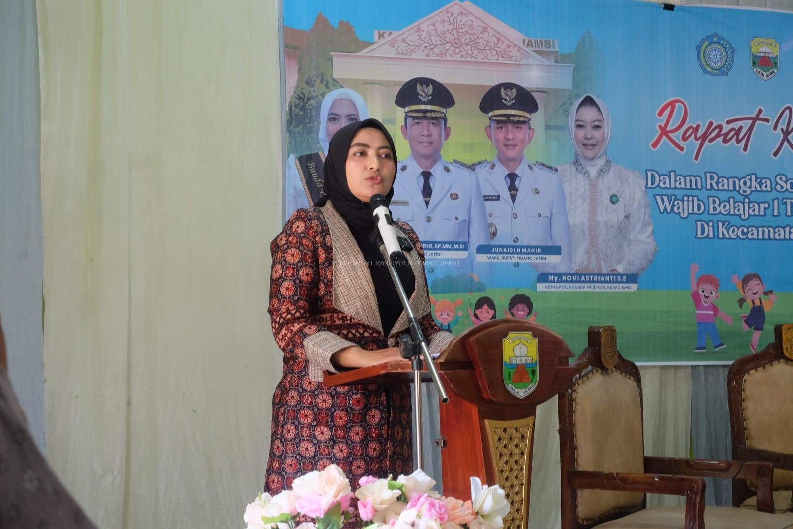 MATTANEWS.CO, MUARO JAMBI – Bunda PAUD Kabupaten Muaro Jambi, Ririn Novianty, SE, menghadiri kegiatan sosialisasi program wajib belajar satu tahun pendidikan prasekolah yang digelar di Aula Kantor Camat Sekernan, Selasa pagi (24/06/2025).