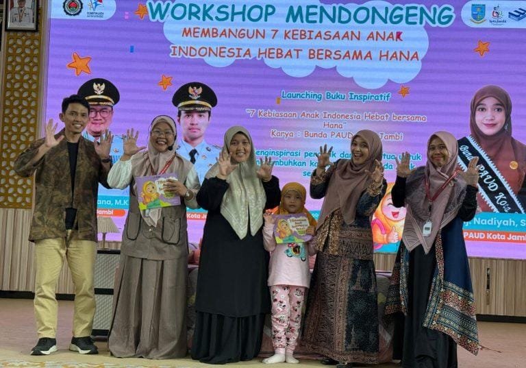 MATTANEWS.CO, JAMBI – Upaya memperkuat literasi anak usia dini di Kota Jambi kembali mendapat dorongan besar. Bunda PAUD Kota Jambi, Dr. dr. Hj. Nadiyah Maulana, secara resmi membuka Workshop Mendongeng sekaligus meluncurkan buku terbarunya berjudul “7 Kebiasaan Anak Indonesia Hebat Bersama HANA”, Selasa (18/11/2025), bertempat di Aula Griya Mayang, Rumah Dinas Wali Kota Jambi.