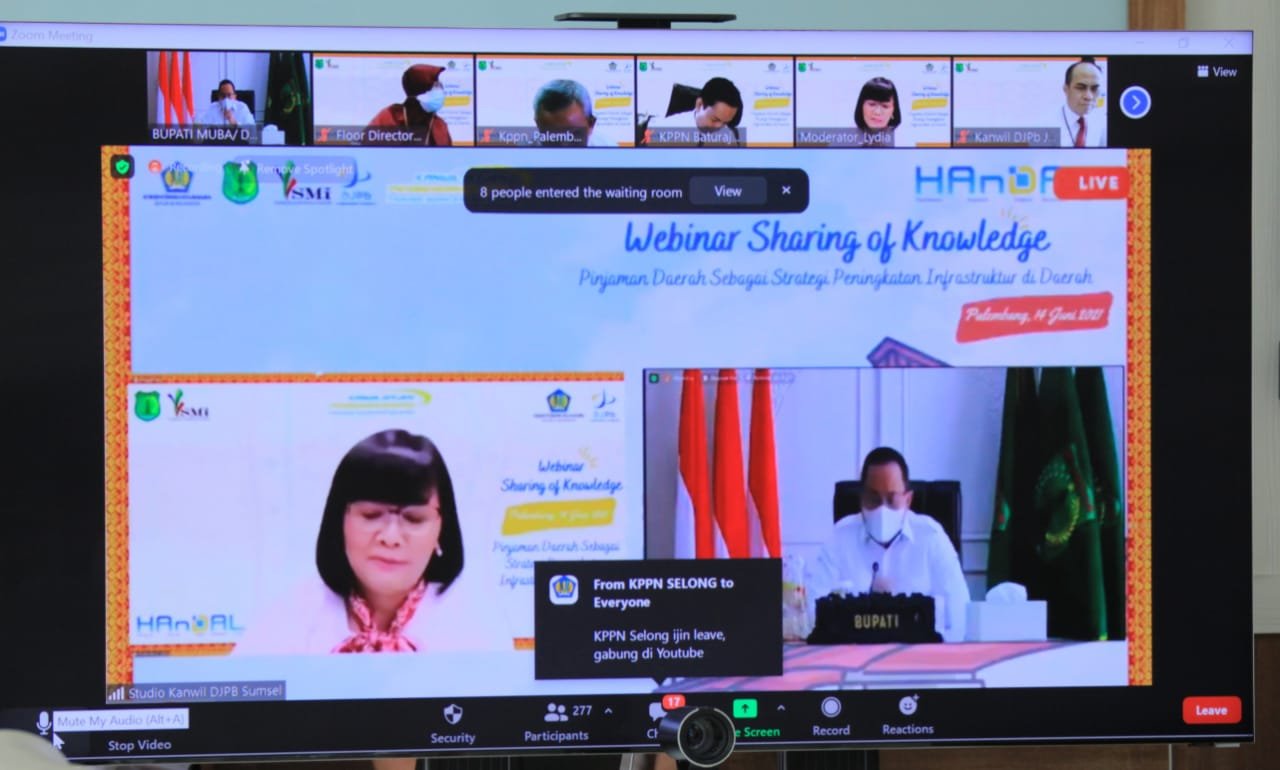 Kegiatan ini terselenggara atas kerjasama antara DJPB Sumsel, PT SMI, Kapasitas dan Direktorat Pelaksanaan Transfer Ditjend Perimbangan Keuangan serta Pemkab Musi Banyuasin. Adapun narasumbernya selain Bupati Musi Banyuasin, Dodi Reza Alex Noerdin, ada juga Direktur Kapasitas dan Pelaksanaan Transfer Ditjen Perimbangan Keuangan, Bhimantara Widyajala, Direktur Utama PT Sarana Multi Infrastruktur (SMI), Edwin Syahruzad, dan moderator dari Kanwil DJPB Sumsel, Lydia Kurniawati.(*)