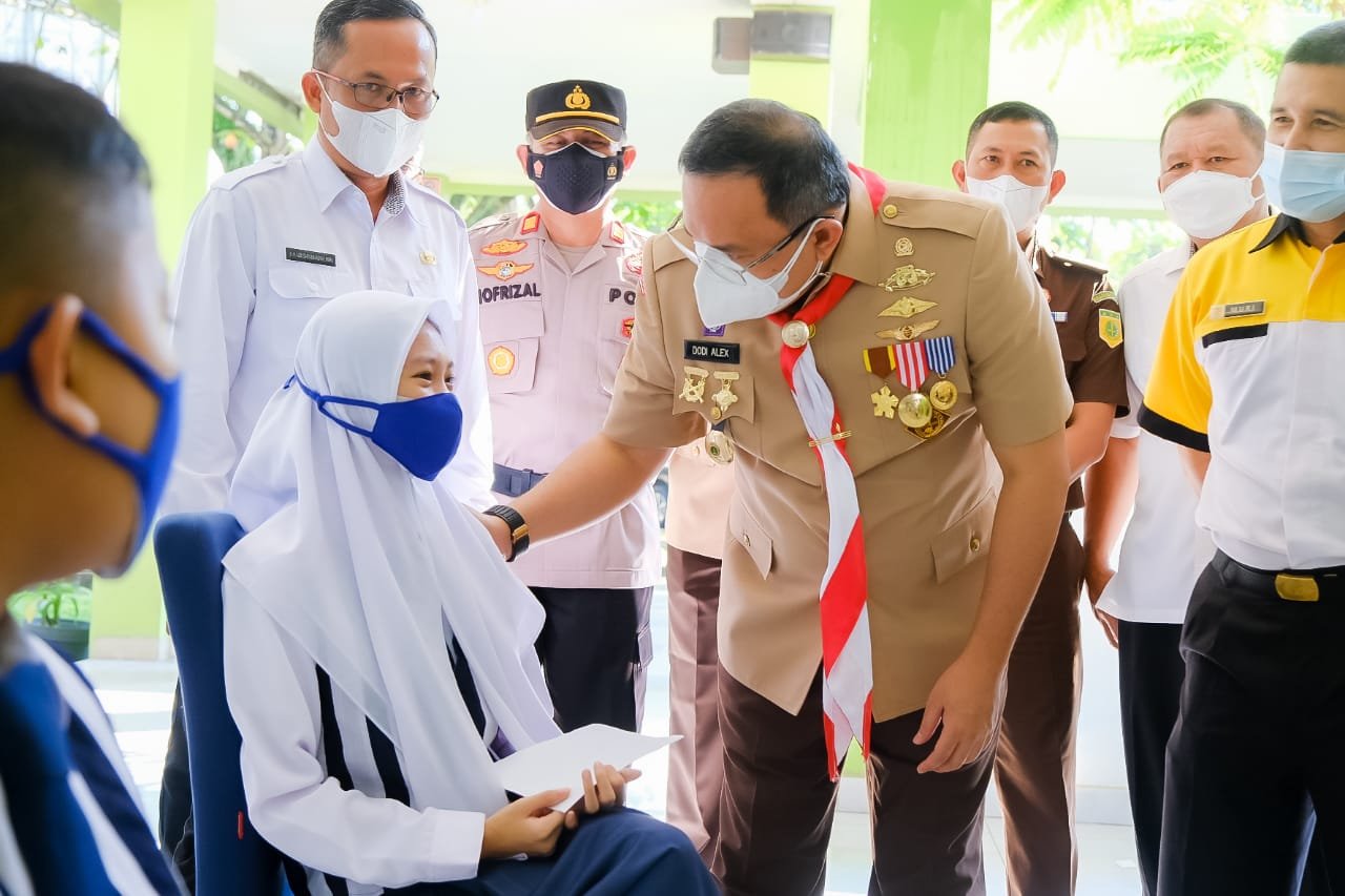 “Hari ini perdana dilakukan vaksinasi, kemarin perdana mulai diterapkan PTM terbatas, agar lebih aman selain tenaga pendidik yang diharuskan sudah divaksin, sekarang anak didiknya juga harus vaksin. Adapun jenis vaksin Sinovac yang disuntikkan bagi peserta didik karena sudah uji klinis vaksin Sinovac paling aman bagi remaja 12-17 tahun,” ujar Bupati Muba Dr H Dodi Reza Alex Noerdin Lic Econ MBA usai melakukan peninjauan vaksinasi bagi peserta didik tingkat SMP.
