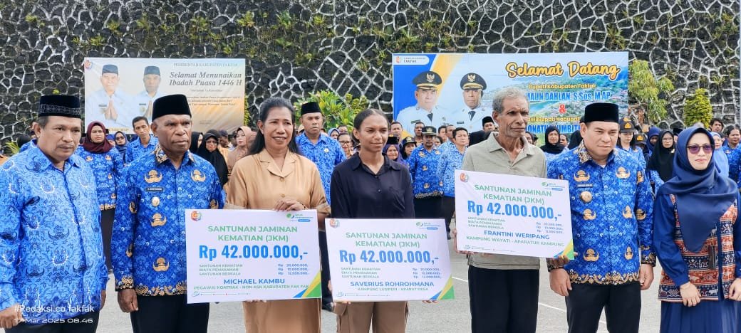 MATTANEWS.CO, FAKFAK – Bupati Kabupaten Fakfak, Samaun Dahlan, S.Sos., M.AP, menyerahkan secara simbolis santunan kematian bagi pekerja rentan usai memimpin apel Gabungan ASN di Halaman Kantor Pemkab Fakfak, Senin (17/3/2025).