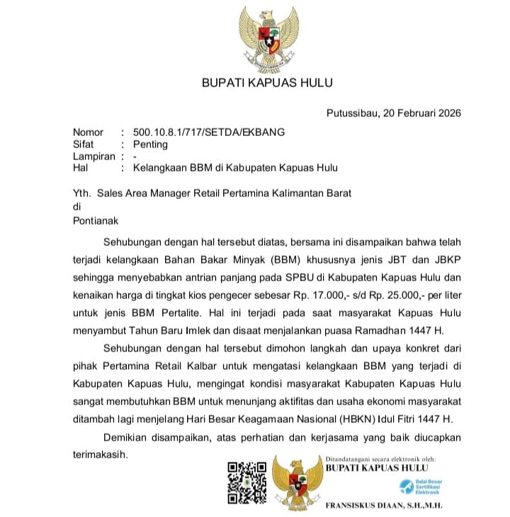 Surat tersebut ditujukan kepada Sales Area Manager Retail Pertamina Kalimantan Barat di Pontianak sebagai bentuk respons Pemerintah Kabupaten Kapuas Hulu atas kondisi yang dinilai semakin meresahkan masyarakat.