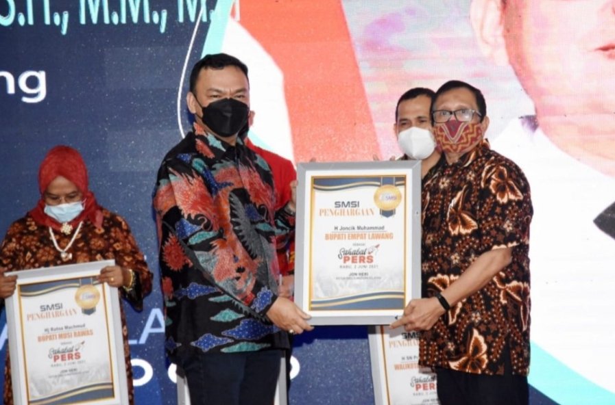 MATTANEWS.CO, EMPAT LAWANG – Bupati Empat Lawang H Joncik Muhammad, menerima penghargaan dari Serikat Media Siber Indonesia (SMSI) Sumatera Selatan (Sumsel), sebagai sahabat pers, Rabu (02/06/2021)