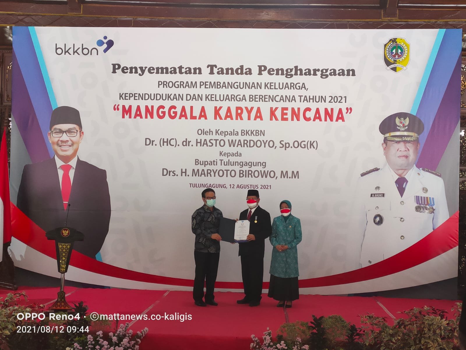 MATTANEWS.CO, TULUNGAGUNG – Pemerintah Pusat melalui Badan Kependudukan dan Keluarga Nasional (BKKBN) memberikan penghargaan Manggala Karya Kencana (MKK) Tahun 2021 kepada Bupati Tulungagung Drs. Maryoto Birowo bertempat di Pendopo Kongas Arum Kusumaning Bongso, Kamis (12/8/2021).
