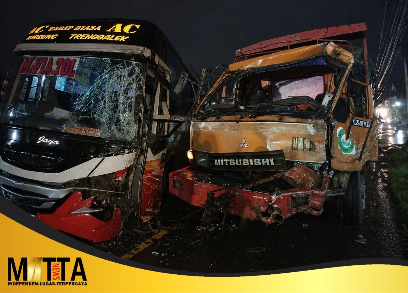 MATTANEWS.CO,TULUNGAGUNG — Kecelakaan lalu lintas melibatkan Bus Harapan Jaya dan truk Mitsubishi terjadi di wilayah hukum Polres Tulungagung, Jawa Timur, Selasa (28/4/2026) malam. Insiden yang dipicu dugaan pelanggaran marka jalan itu sempat membuat arus lalu lintas tersendat, namun beruntung tidak menimbulkan korban jiwa maupun korban luka.