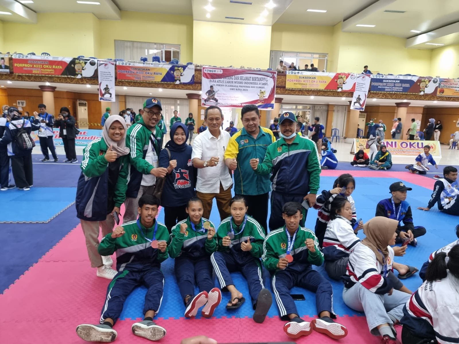 Bertanding di Gedung Kesenian Baturaja, OKU. Kontingen Cabang Olahraga Wushu Kabupaten OKU Timur berhasil mengumpulkan 8 medali terdiri dari 1 Emas, 1 Perak dan 6 Perunggu, Selasa (23/11/2021).