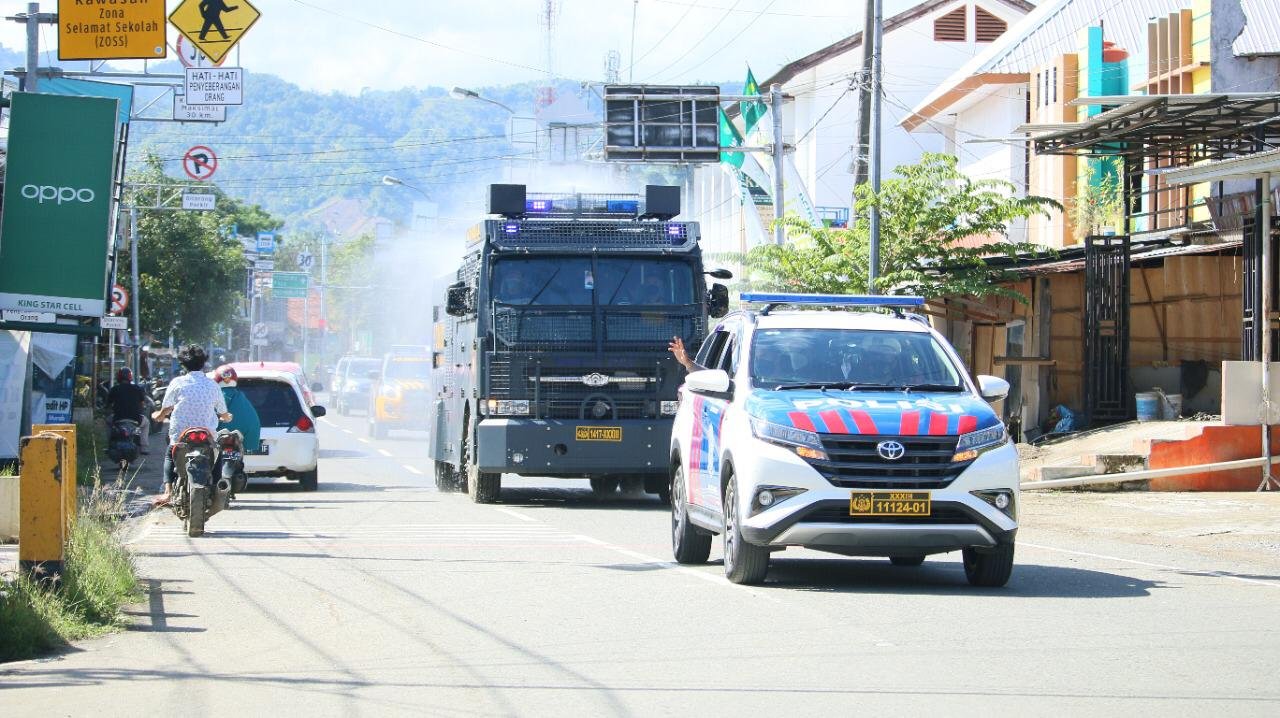 Dengan menggunakan kendaraan taktis AWC (Armored Water Cannon), Satuan Sabhara Sabhara Polresta mamuju lakukan penyemprotan Disinfektan di beberapa ruas jalan dalam kota mamuju, hal ini dilakukan sebagai upaya mencegah timbulnya klaster baru penyebaran COVID-19.