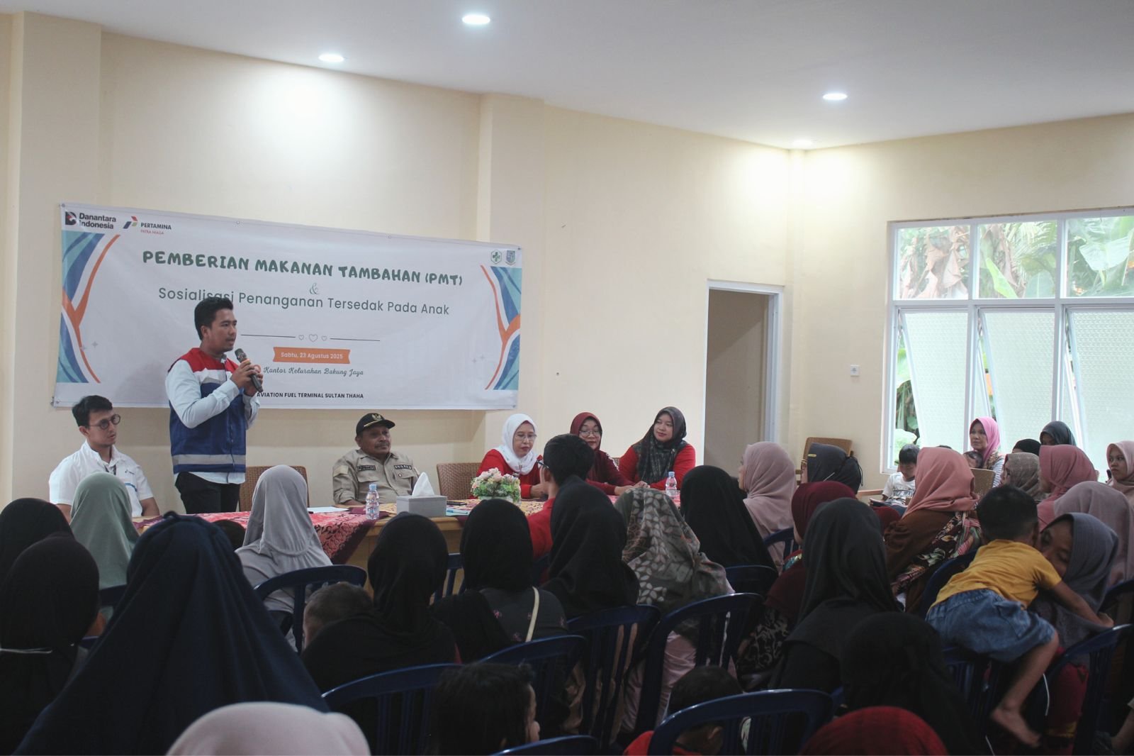 MATTANEWS.CO, JAMBI – Pertamina Patra Niaga Regional Sumatera Bagian Selatan (Sumbagsel) melalui Aviation Fuel Terminal (AFT) Sultan Thaha menyelenggarakan program Pemberian Makanan Tambahan (PMT) dan Pelatihan Penanganan Tersedak pada Anak di Aula Kantor Kelurahan Bakung Jaya, Sabtu (23/08). Program ini merupakan respons terhadap kondisi gizi anak di wilayah tersebut, dimana tercatat 23 balita mengalami masalah gizi kurang dan 15 ibu hamil memerlukan perhatian khusus dalam pemenuhan nutrisi.