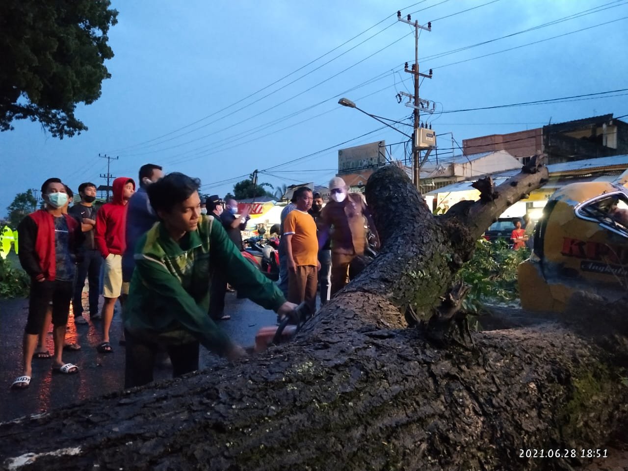Cuaca ekstrem tersebut menyebabkan sebuah pohon besar tumbang dan menimpa dua mobil di Tempat Kejadian Perkara (TKP).