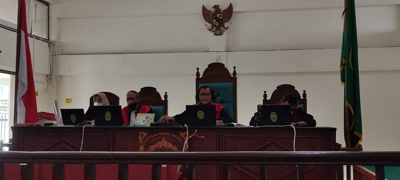 Sidang diketuai majelis hakim, Mangapul Manalu SH MH dan Jaksa Penuntut Umum (JPU) Kejati Sumsel, Desmilita SH MH, dan terdakwa mengikuti jalannya sidang melalui virtual.