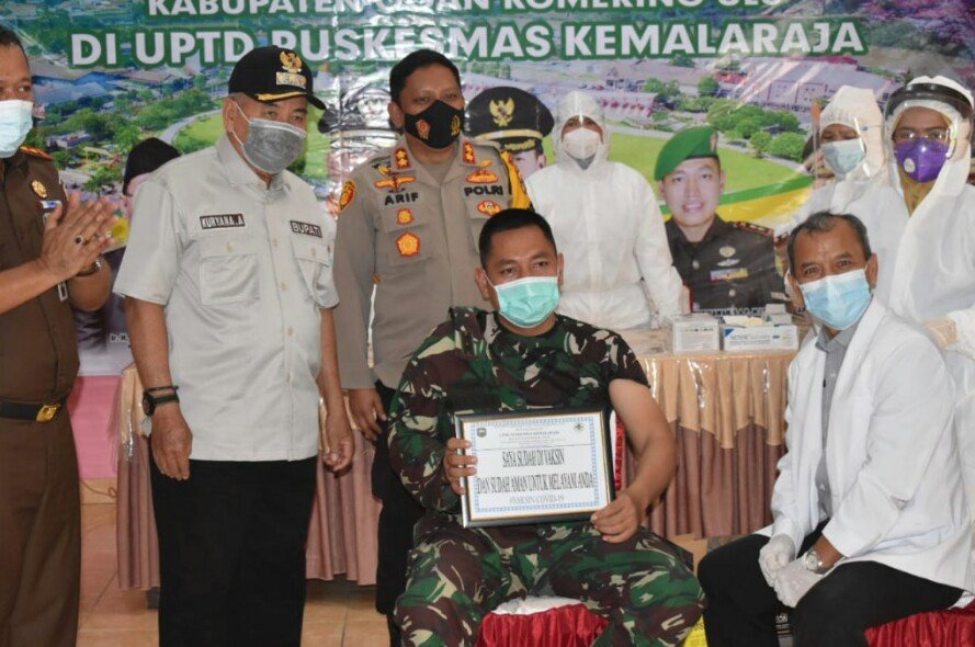 Dandim 0403/OKU Letkol Arh Tan Kurniawan, S.A.P., M.I.Pol menjadi orang pertama yang melaksanakan vaksinasi COVID-19 di wilayah Kabupaten OKU. Kick off vaksinasi COVID-19 di wilayah Kabupaten OKU dilaksanakan di UPTD Puskesmas Kemalaraja OKU.