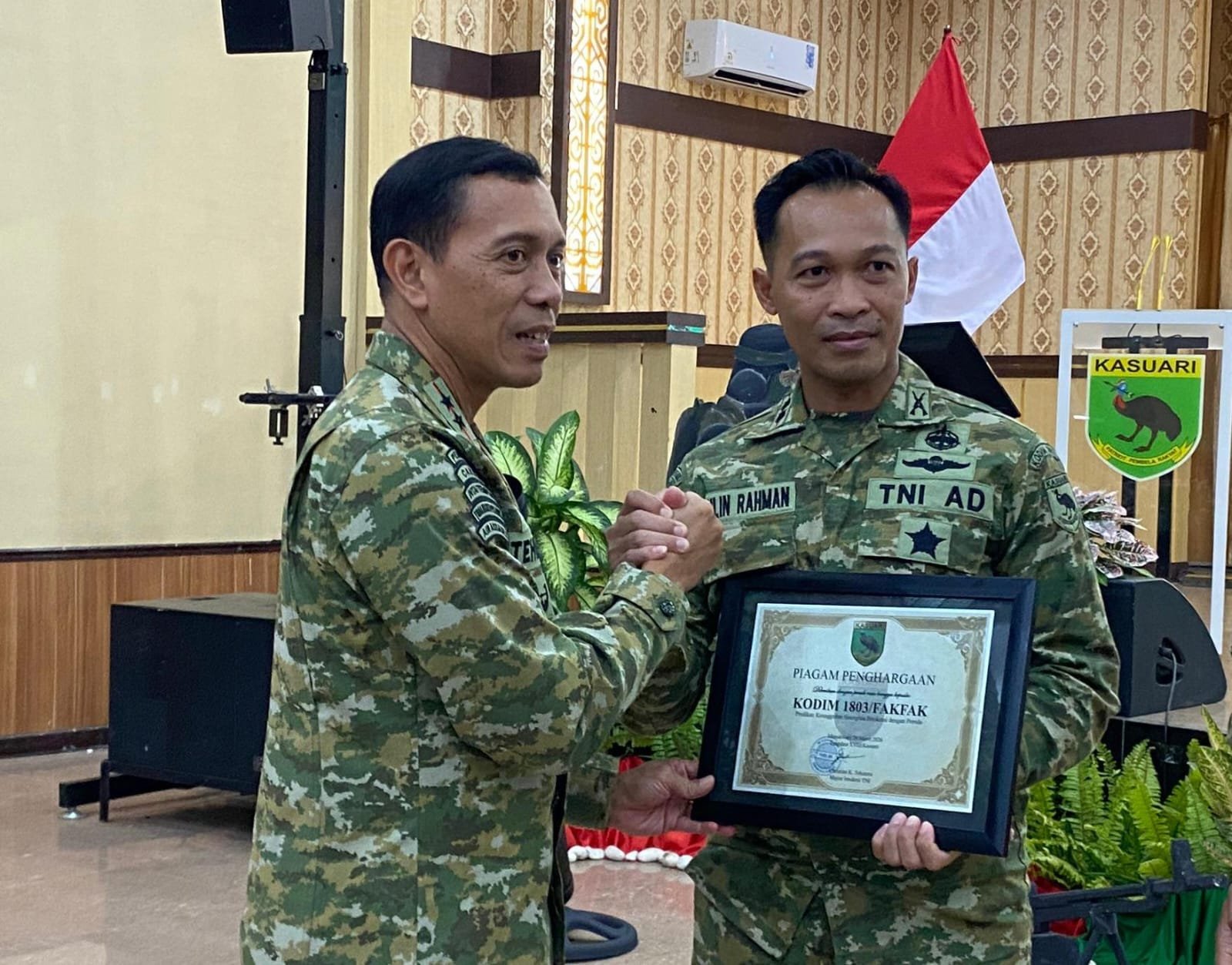 MATTANEWS.CO, FAKFAK – Komandan Kodim (Dandim) 1803/Fakfak, Wahlin Rahman, menerima penghargaan bergengsi “Keunggulan Sinergitas Birokrasi dengan Pemerintah Daerah” bersama empat Komandan Satuan lainnya. Penghargaan tersebut diberikan langsung oleh Panglima Kodam XVIII/Kasuari, Christian Kurnianto Tehuteru, Kamis (26/03/2026).