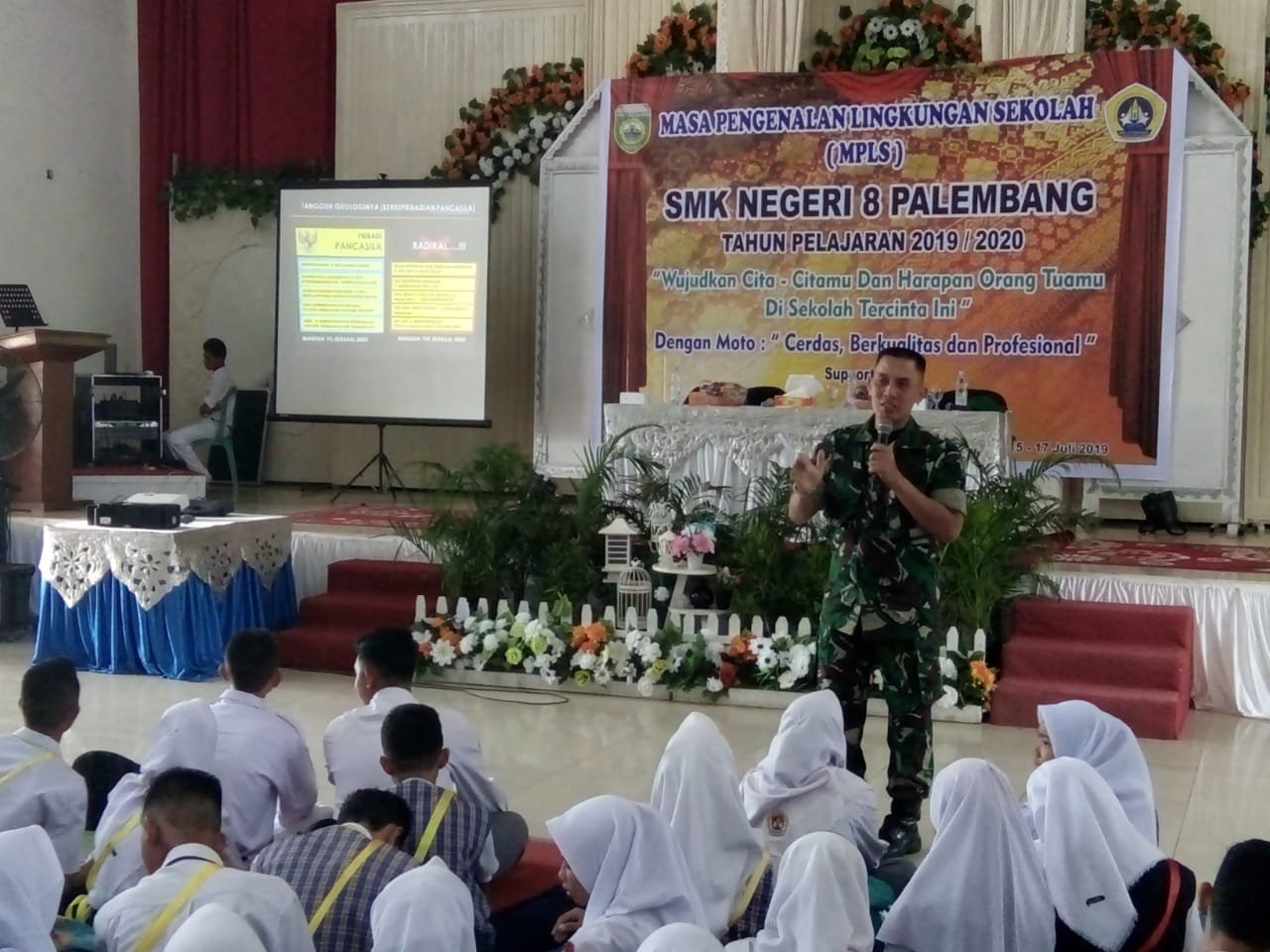 PALEMBANG, Mattanews.co – Dalam rangka Masa Pengenalan Lingkungan Sekolah (MPLS) bagi Siswa Siswi baru Kelas X SMK Negeri 8 Palembang, Komandan Koramil 418-04/Kertapati Kodim 0418/ Palembang Mayor Inf Ardiansyah memberikan pembekalan informasi tentang Wawasan Kebangsaan (Wasbang) kepada murid baru tersebut bertempat di Gedung Joeang ‘45 Jln. Opi Raya RT 26 Jakabaring Kota Palembang yang diikuti sebanyak 456 siswa siswi baru, Senin (15/07/2019).