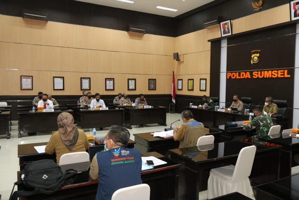 Danrem 044/Gapo Brigjen TNI Jauhari Agus Suraji mengikuti rapat anilsa dan evaluasi pelaksanaan PPKM di Gedung Promoter Polda Sumsel, Jalan Jenderal Sudirman Km 3.5 Palembang, yang di pimpin langsung Waka Polda Sumsel, Brigjen Pol Rudi Setiawan, Senin (19/7/2021).