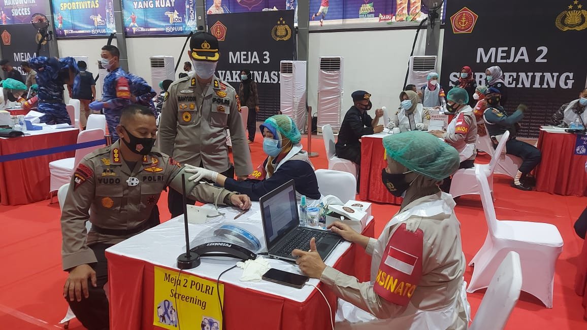 MATTANEWS.CO, PALEMBANG – Komandan Satuan Brimob Polda Sumsel, Kombes Pol Yudo Nugroho Sugianto, jadi orang pertama di Kesatuan Brimob menerima suntikan Vaksin Covid-19, di Komplek Pakri Palembang. Setelah itu, disusul dengan seluruh anggotanya, baik staf kesatuan, Detasemen Gegana hingga Batalyon A Pelopor, Jumat (5/3/2021).